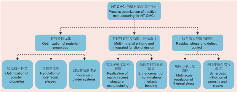 耐高温陶瓷基复合材料(HT-CMCs)因其卓越的耐高温、高强度、低密度及良好化学稳定性,在航空航天、能源等极端工况领域应用前景广阔。传统制造工艺在制备复杂形状与高性能HT-CMCs时存在局限,而增材制造(AM)技术以逐层堆积成形的独特优势,为复杂结构HT-CMCs制造开辟了新路径。该技术凭借直接制造冷却通道等复杂内部构型的能力,显著提升了材料的功能特性及结构效率,并基于服役需求能够实现性能导向的精准调控与定制化生产,同时大幅减少材料损耗,有效降低了制造成本。本文聚焦于HT-CMCs增材制造技术,介绍了其技术原理及应用现状,重点阐述了HT-CMCs材料增材制造体系设计、成形技术、工艺优化等方面的国内外最新研究进展。此外,本文展望增材制造HT-CMCs未来趋势:材料与工艺协同上,突破多材料打印界面瓶颈,开发复合工艺以实现多功能一体化与梯度结构;智能化体系构建上,建“数字控制-实时监测-参数优化”系统,借AI调控参数降低试错成本;模块化与循环制造上,开发可切换标准化模块,创新陶瓷废料回收以提高材料利用率,旨在推动其前沿工程化应用。