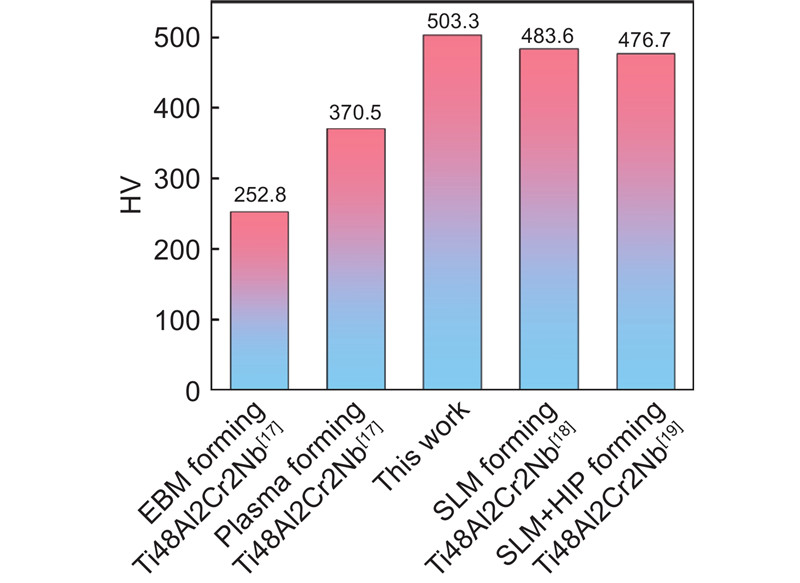 TiAl合金室温塑性不佳,传统铸造和锻压工艺难以满足复杂结构部件的加工需求。激光选区熔化技术(SLM)具有制造周期短、材料利用率高、成形精度优异等特点,被认为适用于航空航天领域复杂零部件的制造。本研究采用Ti48Al2Cr2Nb与4% FeMo60(质量分数)合金粉末混合,制备名义成分为Ti47Al3.5Cr1Nb1Mo1Fe的合金。采用棋盘式搭接打印策略,同时优化打印参数,成功实现低缺陷率(仅为0.49%)TiAl合金的SLM成形。此外,利用X射线衍射、扫描电子显微镜等设备探究组织形成原因。进一步通过热处理工艺将打印态合金中大量的α2相转变为大量的γ相,同时将打印过程中未熔化FeMo60粉末固溶实现固溶强化,合金抗压强度达770.3 MPa,提高30%。本研究为高性能、复杂形状TiAl合金的制备提供了重要参考。
