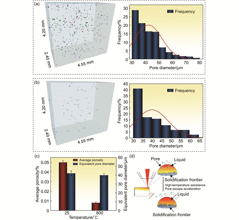 激光定向能量沉积(laser directed energy deposition,LDED)凭借高效率与工艺柔性,正成为解决室温高脆性和高活性的TiAl4822(Ti-48Al-2Cr-2Nb)合金传统工艺难加工、难制备大型复杂构件问题的关键途径,以充分发挥其航空发动机等高温轻质部件的理想材料潜力。然而,LDED过程中快速熔融-凝固循环会产生极大的温度梯度和残余应力,从而导致构件开裂,但目前尚无成熟手段能够完全抑制裂纹产生。本工作利用整体高温辅助LDED制备出30 mm×25 mm×6 mm致密无裂纹的TiAl4822合金薄壁构件,并对其宏观形貌、微观组织、孔隙率及显微硬度进行研究。研究结果表明:在常温条件下,LDED制备的TiAl4822合金薄壁样件易发生以解理为主的脆性断裂,显微组织以细小等轴晶为主;引入800 ℃整体高温辅助后,沉积层晶粒定向生长为自下而上倾斜的柱状晶,孔隙率从0.05%降至0.008%,孔径分布更均匀,表面未见宏观裂纹;与此同时,显微硬度由常温样件的390.46HV0.2降至354.94HV0.2,这主要归因于在高温辅助条件下晶粒长大、晶界减少及析出相中γ相的含量相对增加。因此,整体高温辅助不仅有效抑制裂纹与大尺寸孔隙的产生,还优化微观组织均匀性,为TiAl4822合金的高致密、高性能制备提供新途径。
