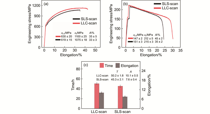 系统研究长直线与短直线扫描策略对激光选区熔化(laser powder bed fusion,LPBF)成形GH5188高温合金微观组织及力学性能的影响。金相与扫描电镜结果表明:两种扫描策略均形成由柱状晶与等轴晶共同组成的混合组织。短直线策略的熔池熔深较小,因重熔不足而中心区保留更多的小晶粒,使平均晶粒尺寸得到进一步细化(17.17 μm)。相比之下,长直线策略的热流方向更稳定,柱状晶外延生长更充分,沿构建方向形成更强的〈001〉织构,平均晶粒尺寸略大(20.86 μm)。力学性能测试表明:两种策略成形试样的室温拉伸强度与塑性差异较小;980 ℃,高温拉伸强度相当,但长直线策略试样的伸长率较短直线策略提升28.6%;927 ℃/90 MPa持久测试,长直线策略试样的断裂时间(50.2 h±1.8 h)及塑性(10.1%±0.5%)显著优于短直线策略(45.3 h±2.1 h,7.6%±0.4%)。断面微观组织分析显示,短直线策略试样的裂纹分布更加密集,且晶界处伴随明显的碳化物析出与粗化,反映出更高的晶界损伤敏感性。断口形貌进一步验证了裂纹主要沿晶界扩展的特征。相比之下,长直线策略试样的晶粒较大、晶界数量较少,因此晶界相关的损伤与裂纹扩展明显减缓。
