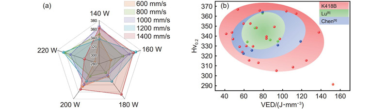采用激光粉末床熔融(laser powder bed fusion,LPBF)技术制备K418B高温合金,利用光学显微镜、扫描电镜和硬度仪分析工艺参数激光功率(140~220 W)和扫描速度(600~1400 mm/s)对显微缺陷、致密度、微观组织及硬度的影响。结果表明,激光功率和扫描速度均显著影响样品的相对密度与缺陷分布。低能量密度易产生不规则孔洞,高能量密度则易形成球形气孔与凝固裂纹;体积能量密度(volume energy density,VED)过低或过高都会降低致密度和性能。最佳工艺参数为激光功率180 W、扫描速度1400 mm/s,在该条件下样品致密度可达99.95%以上,表面缺陷少,仅有少量凝固裂纹,显微组织呈明显熔池边界和胞状结构,维氏硬度达366.8HV0.2。微观组织观察显示,熔池边界处晶粒较粗大,内部可见细胞状柱状晶,局部连续跨越多个熔池,表现出快速凝固特征。硬度随VED先升后降,与孔隙含量及致密度变化一致。研究揭示热应力是裂纹产生的主要原因,为K418B合金LPBF成形的参数优化提供依据,对提升航空发动机关键部件制造质量具有工程应用价值。