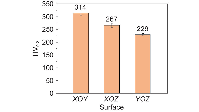 IN718合金构件在航空航天耐高温零部件中应用广泛,但传统机加工制备流程长,材料利用率低。选用激光熔丝定向能量沉积工艺制备IN718合金,分别采用X射线衍射、扫描电镜、能量散射光谱、电子背散射衍射表征合金的物相组成、微观形貌、析出相种类和晶粒特征,利用万能拉伸试验机和显微硬度计表征合金力学性能。结果表明,IN718合金组织基体为γ相,晶界或亚晶界处存在Laves析出相。不同表面组织和性能差别较大,XOY面主要为等轴晶,平均晶粒尺寸最小,XOZ面和YOZ面由等轴晶和粗大柱状晶组成,YOZ面平均晶粒尺寸最大。沿Y方向抗拉强度最高,为842.5 MPa,对应的断后伸长率为17.5%;沿X方向断后伸长率最高,为29.5%,相应的抗拉强度为818.7 MPa。XOY面、XOZ面和YOZ面硬度分别为314HV0.2、267HV0.2和229HV0.2。