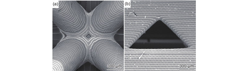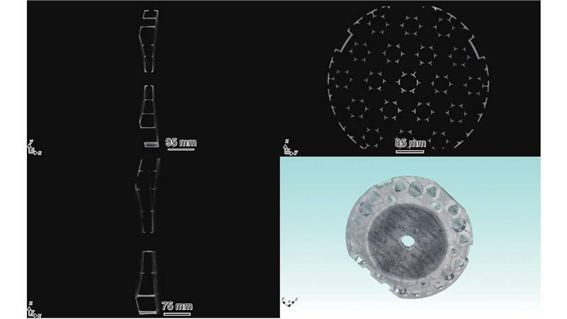 增材制造工艺解决了传统陶瓷制备工艺难以实现的复杂镂空结构的成形问题,能够实现更复杂的结构、更优异的设计,但是打印过程中缺陷难以避免。本工作以光固化增材制造的大口径碳化硅陶瓷为例,采用工业CT无损检测手段对部件出现的裂纹等宏观缺陷进行观察,分析光固化打印碳化硅陶瓷部件宏观裂纹的起始和扩展过程。结果表明,部件中的裂纹自弯角结构、结构孔等薄弱区域起始或进一步扩展,相关位置属于薄弱区域,更容易引发应力集中导致裂纹的产生;此处的打印及残粉处理应重点优化。通过结构优化、打印速率等工艺优化,尤其是薄弱区域的速度梯度优化,有利于避免裂纹等缺陷的产生。