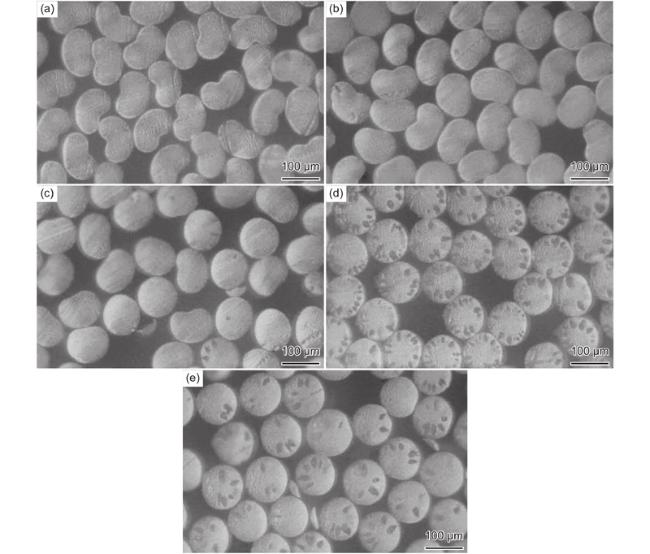 图2 不同凝固浴浓度下初生纤维截面的扫描照片Fig. 2 Cross-sections of nascent fibers under different coagulation concentrations (a)70%;(b)72%;(c)74%;(d)76%;(e)78% |