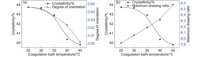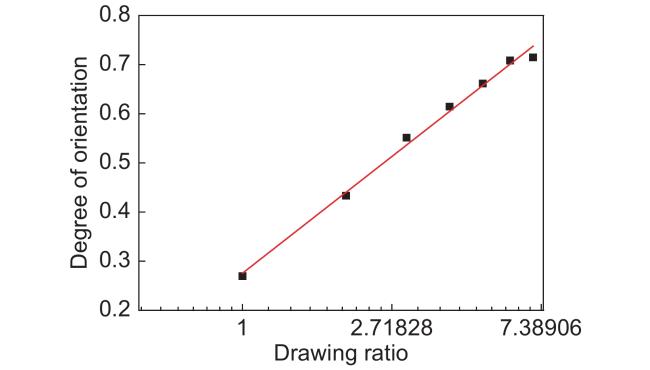 Polyacrylonitrile (PAN) precursors with different orientation behaviors were prepared by changing the coagulation bath conditions such as concentration and temperature. The orientation structure of the PAN precursor was determined by the method of sound velocity. X-ray diffraction and optical microscopy were used to investigate the crystalline structure and morphological characterization of nascent fiber, and the correlation between orientation of precursor and structure of nascent fiber was established. The molecular chain orientation ability " a” was defined as the slope of the logarithmic fitting curve of the degree of orientation varying with the drafting ratio, and the relationship between " a” and the crystallinity of nascent fiber was studied. The results show that the higher crystallinity nascent fiber has, the lower drawing ability PAN precursor has, and the higher degree of orientation has under the same drafting ratios. The maximum drafting factor of polyacrylonitrile precursor is significantly affected by radial structure of nascent fiber, it reaches the local maximum when the coagulation bath concentration is 74%. The fiber with high solvent content has higher molecular chain orientation ability than the fiber with low solvent content. The molecular chain orientation ability of precursor increases with the crystallinity of nascent fiber.