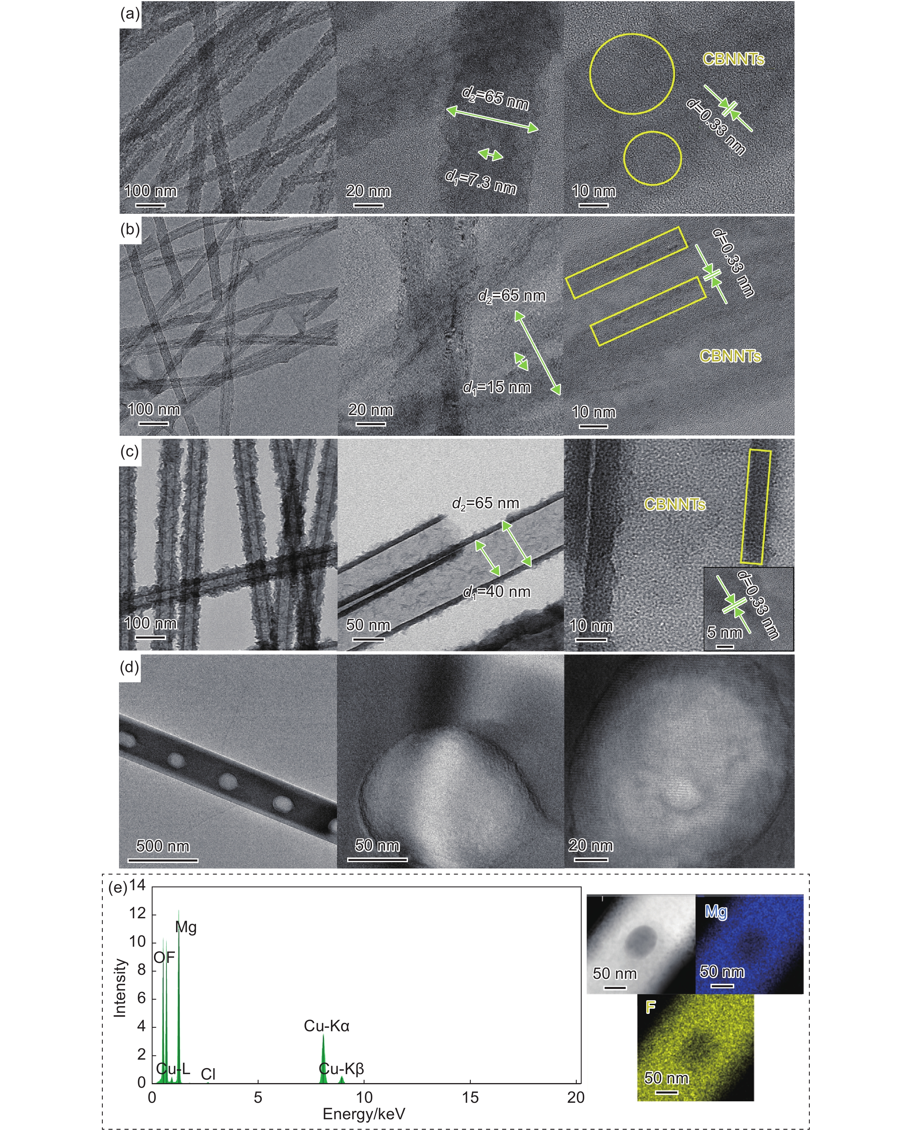 以氧化石墨烯(GO)作为基底材料,MgCl2为催化剂,在N2与NH3的混合气氛下,利用化学气相沉积法将GO转化成还原氧化石墨烯(RGO),同时在其表面生长崩溃型氮化硼纳米管(CBNNTs)合成RGO/CBNNTs复合材料。通过控制反应温度(800、850、900 ℃)可有效地抑制副产物MgF2的生成并控制CBNNTs管壁内径的生长,进而制备出三种RGO/CBNNTs复合材料。通过对RGO表面负载不同管径的CBNNTs,考察RGO/CBNNTs复合材料在2~18 GHz频段内的吸波性能。其中RGO/CBNNTs-900的吸波性能最佳,根据测试数据可知,在13.36 GHz处RGO/CBNNTs-900的最小反射损耗(RLmin)达到−49.17 dB,匹配厚度仅为1.59 mm,上述各项参数均强于RGO。由于RGO的电导率较高且介电常数较大,极其容易引起电磁阻抗失配问题。而CBNNTs的引入将RGO的ε′从7.7降低到5.1,缓解RGO电导率较高、介电常数较大的问题,提升微波吸收性能,此方法为RGO材料在微波吸收领域的应用提供新的思路。