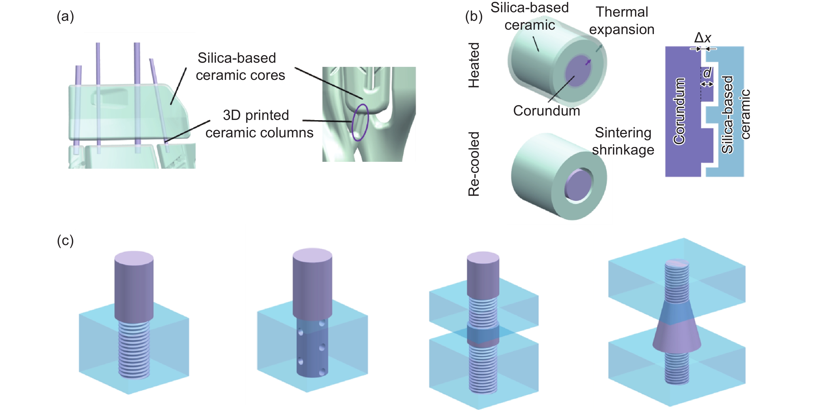 陶瓷型芯是航空发动机单晶高温合金空心涡轮叶片的重要转接件。为解决陶瓷型芯精细结构抗冲击不足的问题,采用光固化增材制造研制复合成型铝-硅基陶瓷型芯,形成尺寸精度和三点抗弯强度分别可达±0.003 mm和314 MPa的致密α-Al2O3相陶瓷精细结构部件,具有良好的抗冲击性;利用热压注成型包裹铝基陶瓷部件的陶瓷型芯主体,其抗弯强度和显气孔率分别为12 MPa和29.5%,使陶瓷型芯主体保证良好的退让性和溶失性。同时,建立铝-硅材料异质界面分离间隙宽度与两种材料热膨胀率、收缩率和弹性模量的关系,采用增材制造铝基陶瓷部件表面微观纹理设计,在复合成型陶瓷型芯上形成镶嵌咬合式铝-硅界面微观结构,提高异质界面的物理结合能力,有效补偿热过程异质界面分离。利用复合成型铝-硅基陶瓷型芯实现单晶空心涡轮叶片的基础浇注验证,工艺孔尺寸符合性高,内腔无多余金属,在航空发动机高温合金叶片精密铸造领域具有广阔的应用前景。
