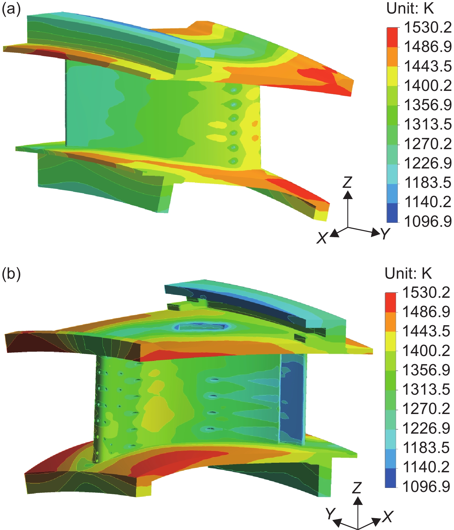 通过对SiCf/SiC陶瓷基复合材料涡轮导向叶片开展数值模拟研究,探究温比和流量比对叶片整体温度及冷却效果的影响。选取变温比和变流量比16个工况进行仿真计算,结果表明,当流量比和温比均增加时,叶片的最高温度、最低温度和平均温度均降低,且下缘板前缘位置出现高温;叶背的冷却效果从前缘到尾缘均逐渐增大,叶盆的冷却效果从前缘到尾缘均先减小后增大。针对单点冷效,当流量比分别为5.28%、7.54%和8.44%时,平均冷效随温比增大先减小后增大;当流量比为3.69%时,平均冷效随温比增大而逐渐减小。同时,中截面平均冷效随流量比增大而增大。